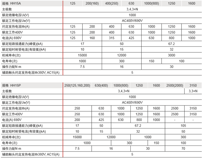 DELIXI德力西HH15A/HH15P隔離開關(guān)參數(shù):